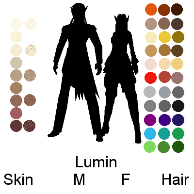 The Lumin are the eldest of the Elfin community, though their dilute bloodlines mean that they are also slightly difficult to pin down. They had arrived around the same time as the Fey and in that location as well, and the area had been known as the Domain of Illumination long before the Fey overtook it. It ran nearly the entire length of the Rotwood north coast at one point, though not deeply into the hills or center of the continent. Many spell books, tomes and devices still are relied upon from this culture; they were extraordinarily good at magic – though in their original form it was mostly spell-magic. However, their highly competitive culture almost destroyed itself and faded from visibility for several thousand years. In those intervening years, their scattered descendants took hold on the rugged lands between the Wyldkin and the Fey. It should be noted that they don’t usually refer to themselves as Elves, only as Lumin. Their emphasis on spell-magic has been tempered in the last few thousand years with reliance on personal psionics and technology. It is likely that they managed to leave and return to Dragondeep via portals of some sort, since their power is both personally-innate, and aided strongly by foci now. They still reside near Rotwood, but farther west and bordering both the Summoners and the Wyldkin. Physically, the Lumin are taller than most Humans, though several family lines are quite stocky; they could pass as fully Human if not for their elegantly long ears and very strong psionic power. They have a wide range of skin tones, eye colors, and hair color and textures, sometimes with exotic shades thrown in with the brown-dominated palette. However, their genetics and powers tend to favor their mothers, while their political and financial influence follows their fathers. There are more males than females by a small margin, politically the women have not challenged for the right to rule – they’re busy enough doing much of the medical, instruction, record-keeping and fine crafting work. Lumin live quite long, in fact they’re capable of surviving and even thriving for many thousands of years. Their childhood aging is slightly slower than Humanoids in general, and they tend to look young for a very long while – deceptive in ways, because a forty-year-old Lumin might attend a high-school with teenagers of other species without drawing notice. Males become sexually mature around age twenty, the females a bit later, and the females can bear young well into their older age. They only very rarely have multiple births and hardly ever more than twins; though when twins are found in a line, they often remain thus and have multiple births at least every other generation. They tend to have smallish families within townships and larger ones in rural areas, but even though they are seemingly immortal, their fertility is not adversely affected. Perhaps due to their ancestry hardly ever living long enough to find this out, it has helped them regain a foot hold on their territory. Though they are long-lived, most Lumin still manage to get themselves killed long before reaching what could visibly be called ‘old age’, from hunting, challenges, magical accidents and exploration. (They’re like Griffins, in that regard…) They tend to look handsome or beautiful, and young, until quite close to their death. The Lumin have five fingered hands, but they’re known to interbreed with other Humanoids frequently enough and with enough variety, that you may see a family with cousins having four, five, or even six fingers based on who might be in their genetic line. It is very well known that they did have to rely on this feature on their return to prominence, because of their low surviving population. For the most part, they bred with Rotwood Elves, and very likely a good amount of Jewel Witches. There are perhaps two or three family lines which can claim to be ‘pure bred’, but in all honesty, no one – not even their own record-keepers – believes them. Only recently have the Lumin actually had to work out ‘who bred with whom’, mainly due to their ‘Bloody Mutt’ king Vaelan. Lumin children are very well educated. The culture of their ancestors was filled with many ways to advance themselves including libraries, schools and seminaries dedicated to magic or psionics. Though it varies among the Twelve Kingdoms, in general all children are afforded a strong basic education (perhaps second only to the Grape Barony, with the Jewel Witches culture closely following them) regardless of their birth circumstances. Children of royalty as well as rural farm kids, so it’s said, deserve equal footing in case one of them might advance. And while they are almost uniformly adept at psionics or magic (and sometimes both), the Lumin culture has eagerly adopted electricity and technology from other cultures and even other worlds. Lumin generally begin showing their psionic powers in their early teens, and are at their full strength around one hundred years. Not all Lumin begin using spell magic, and it seems to be a somewhat dying art in some of the Kingdoms. Primarily it seems that this is a rebound from their prior focus, and it’s said that their diversification is to alleviate any problems from too-heavy reliance on any one feature or ability. Though they, like the Jewel Witches and Clockwork to some extent, are strongly technologically advanced, because of the area in which the Realms rest, there is a bounty of hunting done, and most of the Twelve Kingdoms have a thriving ranch system for both meat and fur exports. There are probably more sheep per capita in the Lumin realm than practically anywhere else (and that’s not counting Wyldkin, of course!). Their textile exports keep the Lumin communities competitive world wide. However strong they are in psionics, the Lumin Kings and their associates also adorn themselves with diadem crowns that amplify their psionic powers – a mi
