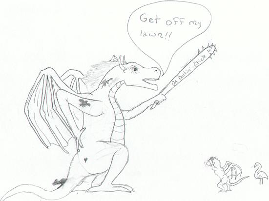 Canny, three headed, and entirely too talkative. Well I suppose that without the heads, she was still me. She had almost glowing wings with the distinctive Matrix markings (had she started there? or just got them modified there?) and that whole chimeric head thing was pretty cool once I got used to it. "I think you should do more art," said the cat head. She tapped her forehoof, and the goat head agreed. "Or more writing, stories are always good. You know that you didn't quite create us, yet you are still our self." "Never mind the mysterious horny one," the dragon said, with a grin. She flicked her poison tipped tail, "you ought to create more worlds again. We cannot do it alone, you know." "We are rather like Aslan," the cat-head asserted with a hissing laugh. "Only not so allegorical." "Especially with a beast like you connected," said the goat to the dragon. The dragon bit at that head but the horns kept her at bay. Wouldn't this be entertaining... *** Chimera-me - who for some reason loved being called by all three of her names - Sara was the cat, Letha was the goat, and Katrina was the dragon - managed to get it into her heads that she should chase off visitors. One day, I was chatting with the librarian in the school, and she handed off this piece of 'fan art' to me. "I think they're a bit scared of the ... other dragon..." "I bet, I think I'm a little scared of her. Oh my gawd," I said, looking at the picture. "The only thing wrong is there's only one cat." "No there's two, look, behind your aching butt," she pointed out the shadowed feline. "Oh wait, here's another one, I think they were trying to get into the yard. Your cats, you know..." "My cats, the cheetahs? Ooookay," I took the next, and it was apparently a running gag that I'd yelled 'get off my lawn' more than once in jest. Maybe they didn't realize I was kidding? "I'll have a talk with her, because this," I waved the paper in the air, "is hardly how I want to be remembered..."
