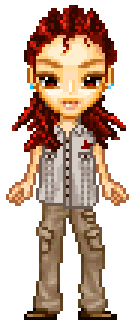 Skin: ruddy, Hair: auburn red, Hairstyle: afro-curled, very long, Eyes: dark brown