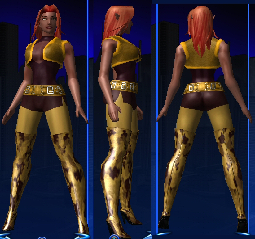 Clothing -- Summer: silken bodysuit of tan, with cloth tunic in dark brown, high leather boots, big belt and leather vest