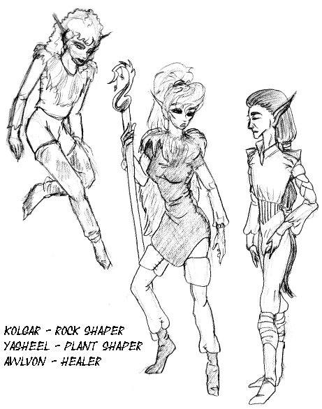 Tall-Ones, near firstcomer elves Kolgar Bonded/sponsor to: Daeoreon (lapiz male mountain), Nenani (pearl female mountain), Ai'Ling (blue female Kiudragon) Age: 15,288 Sex: Male *** Yasheel Bonded to: Age: 14956 Sex: Female *** Awlvon Bonded to: Pahari, female Blue Kegawa Age: 15,068 Sex: Male ** Preserver: Honeyhat, a feminine seeming creature with brightly yellow body, darker golden yellow and pale white-gold wings, green eyes, who wears what appears to be a bit of honeycomb on her head. As far as Preservers go, she's almost sedate. She tends to hide among Kolgar's curly hair and fur pieces, and comes out when they're traveling only when the sun's not directly on them lest her hat melt... She's a bit odd even for preservers. She does sing, but actually sweetly, more like the song of a hummingbird or lovebird, than the raucous noise that comes from others. Her duties to the trio are solemn: she will not leave them unless all three of them insist upon it, and even then she'd be very likely to follow them and keep them 'safe'. She's responsible for keeping them in wrapstuff coccoons when they wish to rest, and is highly responsive to their decision to leave it - however she has had difficulty figuring out how to remove them from it. Last time, she had to have small animals actually chew holes in it until they could be opened from the inside. (Which goes against everything that she knows, those coccoons are not supposed to be disturbed...) |