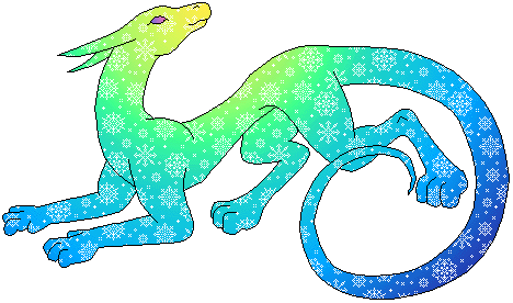Shalesanri Female Ryslen Flurry 2003 Eastern Rainbow Green Parentage: Rainbow White Hyperith & Light Blue Lorccanth (Ryslen) Size: around 29 feet long, about 7' at shoulder (mostly) Abilities: Wingless Flight, Snow Control, Inspire Dancing ** Please note: Ryslen Flurry markings *do not* inherit!! Some other pattern might, but snowy stuffs is the realm of Ryslen. |