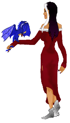 "We've got a number of them in the records rooms," Baeris says, standing up. You notice with a bit of amazement that she is quite tall, built long like her arms looked - they are in proportion to her slender long body. Her hair falls to her low back. The big blue fire lizard on her desk leaps into the air and with one big flap of his wide wings, he lands on her shoulder.