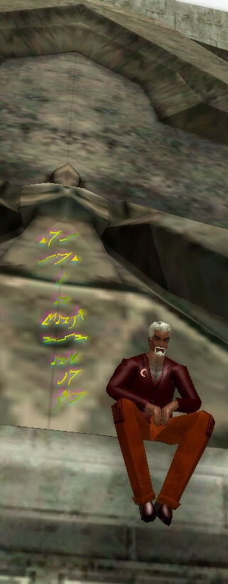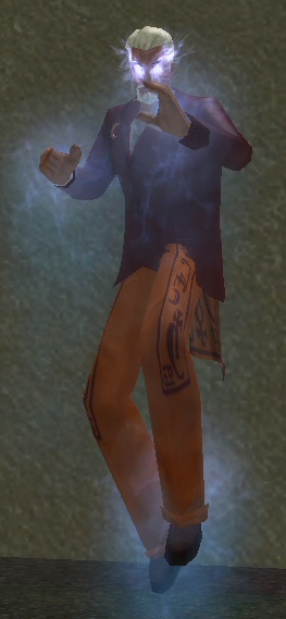 This man makes you think of an unstoppable hunting dog. He has round black eyes that are like two cups of black coffee. His luxurious, straight, milky-white hair is very short and is worn in an elegant, dignified style. He is very tall and has an elegant build. His skin is deeply-tanned. He has long-fingered hands. His wardrobe is unusual, and is completely red and brown. |