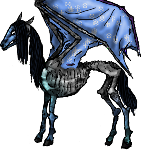 Snow Thestral! Uma's not sure when this guy arrived, but he is certainly fit for winter. His skin, while still taut and hard around his ribs and shoulders, shows a glistening kind of snowy-icy-white. His lovely wing sails are a bright contrast to everything else. Especially other Thestrals. ((DNS Winter Gather dragon 2007)) |