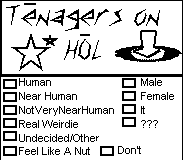 This is where your basic information will go - whether your Teen is a human, or alien, or perhaps something between. Their gender and whether they're "a nut" or not also goes here. First choose or roll TYPE, then GENDER, then if the Teen is a NUT or NOT. See below for instructions! |
