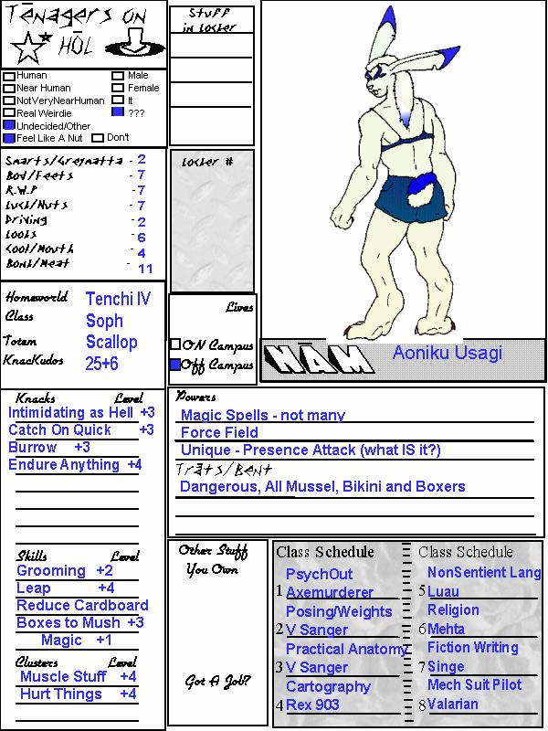 Aoniku Usagi, for lack of a better word for it, is scary. So far, no one has been able to determine what gender it might be - maybe both, maybe neither. It runs about wearing both a bikini top and boxer shorts, has a six-pack of an abdomen, and is literally head and shoulders taller than almost every single member of Carramba High's staff (and that's saying a lot). Though it's not very smart, Aoniku does catch on to ideas and plans quickly. The comment it usually gets from instructors on any grade cards is "interesting, I didn't think you knew that much about this subject". It's best class of course would be Posing and Weight Training, and for some reason it's gotten stuck in the Fiction Writing class... No one knows why. Perhaps to expand its educational horizons? Its fiction often consists of fanciful tales of tunneling and warfare. While it's gotten a lot out of that Mech Suit class, there are no mech suits on Tenchi IV. Perhaps it intends to bring one back. That would be a hoot. One odd thing about Aoniku is that it can remain motionless for long periods of time. Not even its ear tips twitch, though it can be seen breathing. Perhaps this is an old Usagi trick to fool predators, or a new adaptation to keep itself from being hunted by some of the less scrupulous predatory-races found on campus. |