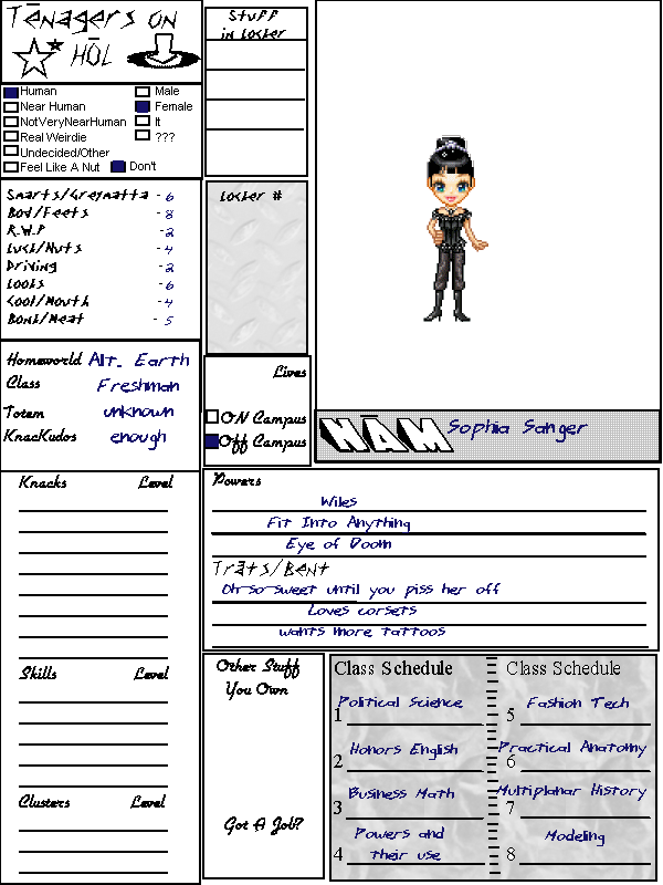 If Vina Sanger had lived to see her daughter slipping into her favorite leather corset, she might have exploded. Or, helped her get into it. Sophia was her mother's pride and joy, while Soren took lessons from merely observing, Sophia could learn directly how to bat her eyes and how to speak in just the right husky tone. Sophia is a temptress, make no mistake about that. As her brother is a masculine Siren, she takes any situation and makes her way to the top of it using any means necessary. Naturally her Modeling class is her highest priority. However she really does enjoy Fashion Tech as well. Her bane on the other hand is Multiplanar History. She knows there are many different versions of Earth out there. But she just doesn't care. *** "I love your hair," Miranda Varnhagen, the Business Math teacher, said. It was after classes, and Sophia had stopped back in the room to pick up some notes for Crazy Doc Sanger. Apparently the two knew one another outside of the school system, or perhaps in another universe. That was one of those things Sophia wasn't clear on - which came from where, who was native, that kind of crap. It wasn't her 'thing'. It was clear to Sophia anyway that her mother's male doppleganger (who kind of took precidence in her mind, because, well, he was alive, and Vina had died when she was a child) had either had sex with or flirted at practically every single member of the school's staff. Well, in many cases, who wouldn't? Varnhagen was very pretty, if a bit old for Sophia's tastes. She hardly cared which gender she was looking at, though she'd been warned several times that teachers were strictly off limits. Twoarth's (that's the world where Carramba High is, she reminded herself repeatedly) policies were a bit different than in many exclusively human worlds, but they still didn't approve of student-teacher physical relationships. Wait for graduation, was the mantra that she and her brother Soren chanted often enough. Getting back to the present, Sophia giggled and prodded at her hair. It was lifted into a little flat curl at the back of her head, framed with a row of barrettes and baubles that brought out just how black it was. Miranda's was quite dark, and had the same kind of heavy strands that Sophia did. "I could style you," she suggested. The instructor brightened right up. They chatted about this and that, and eventually got on the subject of Sanger. Sophia immediately recognized the signs of 'crushing' from the woman, but with a mature air. They were friends first, scientists second, and lovers third. "Don't you want a bit more out of ... your relationship?" Sophia prodded gently while she combed the woman's thick hair. "I mean, friends make the best lovers." "Of course they do," Miranda said, eyes closed and with a gentle smile on her thick lips, "but we're both quite busy. We actually spend more time together in off hours now, than we did before he bonded Umpteenth. Since he comes with us to the dragon events, you know." "That's nice," Sophia said, faintly disappointed that her powers didn't seem to get any farther than that. It was always so much easier to push a pair into a hot and heavy frenzy when they already liked each other! And if anything compelled Sophia to action, it was that there wasn't nearly enough hot and heavy going on around her. She knew that Crazy Doc was getting whatever he wanted, but ... For all intents and purposes, if he wasn't getting who she thought was good for him... Eventually, after trading makeup and hair tips with one another, Miranda had to go and Sophia began her walk home. It was not far, but it was into a neighborhood where there had been quite a lot of gang activity. Since Alabaster had taken care of the prior gang, others were ready to take their place. Lucrezhia and Lucien hadn't put up further magical barriers while they'd been residing in the complex, so slowly the encroachment started again. Sophia saw the gang tags, first one building, then a beatup fence, then on trucks parked in a dock. Whoever the RatSkullz were, they were hardly the kind of image that Sophia wanted to see portrayed around her home! While she made it home without incident, she'd seen clearly three gang members hanging out trading insults and watching her from across the street. A keen little laugh in her mind was echoed a bit later, in the apartment's common area. When she talked to Tamsin about getting rid of the gang. "But we don't have powers, not like -" she waved her hands in the air like she was casting a spell, "'Powers'! What can we do? I mean, we're pretty and everything but we're hardly superheroes on our own." She sighed, "especially me and Thomas, really..." "No, no, you're exactly the person I want to help me..." Sophia said. The wicked grin she had grew on the girl rapidly, after she told the plan... They waited until evening, and Sophia got Tamsin dressed up more like her, less brightly and colorful, more black and leathery. They applied makeup, did their hair and nails. And then they went out to find the RatSkullz. This gang, while named after an animal, were all human - even though there were a good number of kin types in this neighborhood. Perhaps their name was meant to sicken the rat-kin populace? They were found easily enough in just about the same place they'd been while Sophia walked home. "Hey boys!" Sophia called, and though Tamsin was supposed to be brave in battle she could feel the otherworld-twin wince. "Do your thing, Tamsin," she said quietly while the men were approaching. Tamsin obeyed, though she wasn't sure why. What could her powers be enhancing? She found out soon enough! Sophia's body didn't change, but for all intents and purposes she was hardly a fifteen year old any more. The way she was stuffed into the corset and skirt, while elegant, made her look as though she'd be much more comfortable if only one of these gentlemen helped her out of them. "We're looking for someone to ... talk to," Sophia said. Tamsi