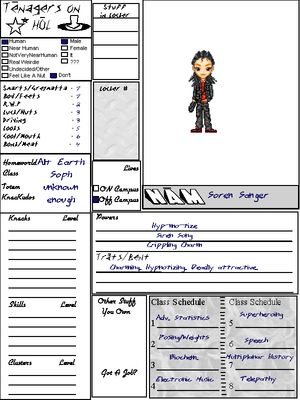 With a beautiful singing voice and a gaze that can disarm any hardened heart, Soren Sanger is the ultimate seduction machine. He carries with him an instrument similar to a Liberation (a keyboard with a fingerboard like a guitar for pitch and chords) which he uses to sing his way through the halls. He often has a following of smitten girls - and guys, he's not picky. He's really cute too. In that roguish kind of bad-boy way. Though he and his sister are smashingly intelligent, Soren just doesn't like doing Biochemistry. His reasoning? He'd rather be handling the full monty rather than just the molecular bits. On the other hand, his Speech class is planning on nominating him for speaker of the year, for the Sophomore class. *** Soren is standing at Wu *** Soren sat by his bunk, and played a little tune on an improvised harp. His lovely green dragonet, Shonaith, sat and listened. Did you want to sing me to sleep, or should I sing along? Shonaith asked, groggily. "Oh, it's time for you to sleep, Shonaith," Soren chuckled. If there had been any girls in the dorm that laugh would have completely done them in. As it was, the green dragonet remained his best audience. She wasn't swayed by the magic in his voice, she was a critic through and through. Of course that started with their impression, where she was rudely broken from her shell by her blue brother, and demanded he apologize for it. After all, she'd nearly been run over! While she was picky about who came near her, and how she was treated, Shonaith also seemed to have it inside her to beat the competition cold. She was the first female of the clutch to hatch, right? When she'd fallen asleep, Soren got to writing a letter to his sister and the people at Carramba High. It would be soon, that they'd come and pick him up. Maybe the Doc would come himself? Soren wasn't sure that Crazy Doc Sanger had ever been to Wu. It was a nice place, and Soren wanted to stay longer. But duty called, and the school board insisted that if he and his sibling - and their other-worldy dopplegangers - were to be at Carramba High, they'd have to take classes consistantly. Curled up around him on the bunk, Shonaith purred in her sleep, dreaming of this place they'd be ... a school with dragon riding courses. She was certain to love that.