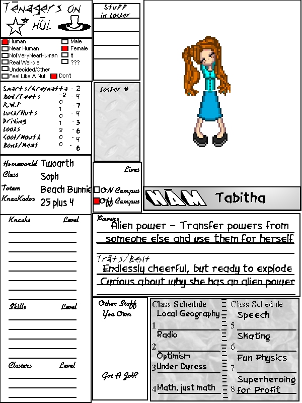 Tabitha loved roller coasters. As a very young girl, she would assemble her own rides out of cardboard boxes, various bricks and stones, and her big brother's skateboard. The moment she was big enough to ride even the 'kiddiest' of kiddie rides, she almost never stopped. With that in mind, Tabitha's unusual powers kicked in right about the same time that she began to ride a local coaster. The Earthquake, a big old wooden coaster not known for its speed or size - but more for its appearance and duration, and the shuddering of its cars over the old metal tracks, was where she first met aliens. A girl about her same age, only with brightly green skin and little antennae sat next to her on the ride. When they went down the first of three big hills, the girl clenched onto Tabitha's arm and didn't let go for the duration of the ride. Tabitha, being an old pro at the riding game, let her do this... And then when they got off the ride, they both were literally bouncing with joy. The alien girl had somehow let Tabitha 'borrow' her Bounce power! It wasn't too long after that, that Tabitha tried it on someone else, and found she could utilize other powers. But there are no superheroes in her lineage, there's no good reason - at least none that she's been able to find - that allows her to do this. She's been on a search ever since. Bouyant and friendly all the time, but tingling with the desire to locate some kind of 'origin story', Tabitha is almost obsessed with these powers. She also wants to try every one she can find. Her 8th Period class is ideal for keeping her on the ground when she doesn't have a flight power... *** With the stresses of daily life left behind, Tabitha and her family had gone on a camping trip during Spring break. The mountains were nice and clear, some snow still on the peaks but most roads open, and no chains needed for the tires. Tabitha gazed out at the hillsides, as they climbed steadily into the mountains. She loved being outdoors, it was very ... freeing. But also, she really missed her friends. A couple birthdays, presents left for the girls, and some homework that got done before they left... She sighed. The thing she missed most was being in contact with proper aliens and superheroes. She wasn't sure, but she felt strongly that there wouldn't be any flying around or shapeshifting up here in the boondocks. They reached their camp site, which was a nice wood house cabin out near the wooded lake, overlooked by a towering snow-capped mountain. There were a dozen other such houses scattered around the lake, and perversely Tabitha wished that maybe a deranged killer or some tentacle monster would show up just so she could steal its powers and turn them back on it... But she still enjoyed being out there. The air was so fresh - she rarely noticed when they left Crescent City that the air down there was very thick with sea salt and a bit of polution. The air here was heavy with sap and pollen. It made her mother sneeze, and their dog came back covered in some ... thing... from the tall grasses. Tabitha was assigned to clean the dog. She really didn't want to but did it anyway. That was what her Optimism Under Duress class was all about, anyway. They walked toward the lake shore, hoping that the water was not totally freezing. "Come on boy, you can't come into the cabin smelling like that." She said. The dog barked happily and lept into the water, causing a plume of cold ice-runoff to land on Tabitha. Drenched, but laughing, Tabitha waited until the dog had gotten good and wet before calling him back out. "Now don't go rolling in any more ick!" She warned him. She wished she'd had the time to find one of her friends that could talk to animals for this trip, because she could hold on to a power for a while if she concentrated on it, and there was wildlife aplenty out here. While they were walking back to the cabin, Tabitha saw two deer, a load of bunnies, chipmunks, birds and even some fish that lept out of the lake water. "They probably think it's cold too," she muttered. When she looked back to the trail, her family dog was running on ahead, but there was a small trail that she hadn't seen before. Glancing to the lake, back to the cabin and then the trail, Tabitha decided to explore. She wasn't all that wet, and the day was young - she could dry on the trip. The dog reached the cabin, greeted happily by mom. She walked for a while, twirling her long brown hair around her fingers. This wasn't so bad - the day was getting warm, and though there was a breeze, it was only helping dry her off. She made very little noise on the underbrush, getting over one hill. Then Tabitha stopped. There was something there - and she'd never seen anything like it before. It wasn't very big, not much larger than their dog. But it was pastel beautiful, with wings, and an almost canine build. A doe-face, odd. The creature looked up when Tabitha came through the twin trees at the crest of this little glen, but it did not run away. "You have found me," it said. Tabitha jolted back - not thinking it could speak. "I guess I have," she said, trying to act casual. That was another aspect of her Optimism class - if she acted like she knew what she was doing, half the time, she really did know what she was doing... "I have something for you. You are a very special human." It said. Then it nuzzled something small, bigger than a softball, but smaller than a basketball, with its nose. "Take this, and keep it safe. You will teach it all it knows. Do you think you are wise enough to do that?" Tabitha's eyes grew wide. "I ... I'm just in high school, I don't know everything." The creature seemed to smile and rolled the egg thing toward Tabitha. "Now I know you are the right person for my child..." "Your - child!? You lay eggs?" Tabitha thought that was pretty weird. She thought mammals laid eggs. But this thing had wings. Before Tabitha knew it, the creature had flown off - or maybe just vanished. Left in the 