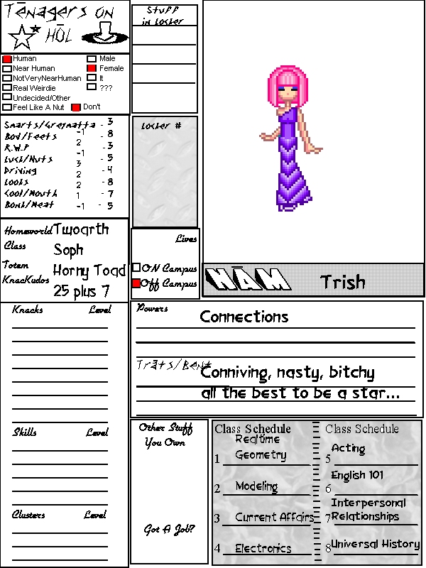 Trish's day wasn't going so well. Not only had she forgotten her Realtime Geometry homework, but she had broken a heel on the way to the school, and of course she wasn't quite old enough to drive. She had to walk all the way to Carramba (all of six blocks, go figure) with her shoes in her hand and her fist clenched on the other side. She knew what Rex 209 would tell her. That robotic entities like himself don't forget homework or could download it from some satelite link - of course she'd done the work. She just forgot that her little brother Simon was all about getting his own work done, and he'd managed to grab hers instead. No one would notice of course, because he attended half the same classes she did, two years in advance. She didn't much care for Simon. He was way too smart. He'd skipped a grade, and probably would do it again. Trish thought that it would be okay if she could just skip right to a career. She was more than pretty - she was stunning. But her parents had wisely kept her out of the fashion show and beauty contest scene, after the frightful things that happen to children in those families. But that meant that she was fifteen (and a half) and didn't have an agent or anything. She moped around outside her locker, and then trudged to class. Rex 209 was predictable in his response. The automation wasn't one for being swayed by a coy smile or the batting eye. Freakin' robots. The day wore on, painfully. Third period Current Affairs was a mess. She'd only decided to take the class because she thought it had something to do with soap opera plotlines. What a mistake that was. Though she was pretty good at keeping up with the real course, and it was pretty funny that the instructor Dominique Talshoy kept a calendar of soap opera events on the bulletin board after Trish told her why she'd signed up. It was nice being taken seriously by someone, even when she'd screwed up. Acting was exhausting, but the most rewarding part of her day. Since Trish had a lot of charisma she'd been chosen to portray the lead role in a play, though it was only for the acting class to view. Later in the year, there would be a more serious school-wide play to try out for. Finally, lunch time rolled around. How anyone made it through till then was a mystery. She wanted to mope more, but her brother came up to her and stared at her as she ate. She tried to concentrate, just bite the sandwich. Just drink the juice. But no. Simon stood there, unblinking, until she glared back at him. "What do you want, Simian?" "Cute, for someone who got their butt served to them in Geometry," he said. "I turned your homework in for you. Sorry, it got in my bag by mistake again." "I know," Trish grumbled. "Stop doing that." "Well, I'm sorry, maybe if my apology and turning it in for you isn't good enough, then my gift won't be either." The thirteen year old redhead turned away and was about to get up to leave, but Trish stopped him with a firm hand on his elbow. "Gift?" She said. "I accept the apology. Thank you." Turning back, Simon - or Simian, as Trish often called him - smiled broadly. "I found this, and I thought you might like it. You always say you want to have some kind of fur draped around your shoulders, well - I think this will hatch to have fur. Or something." He handed off a little egg. It was heavy, not like a chicken egg, and it was pretty blue. "Where did you get this?" "It's a secret, sorry." Simon grinned again, and left her with the egg. Trish had to quickly finish her lunch and truck on over to her Interpersonal Relations class, which again, she'd kind of made an assumption about what it was for too - but this one was closer to her imagined use. She kept the egg hidden, and brought it home. Simon wasn't really talking to her at home - they always gave their parents the impression that they were at odds, when they really were just acting. "So... what am I supposed to do with you... Wait until you hatch. Sounds like a plan," Trish said to it. She put it in a handbag with a furry lining, that would keep it nice and warm. Then, she waited for it to hatch...
