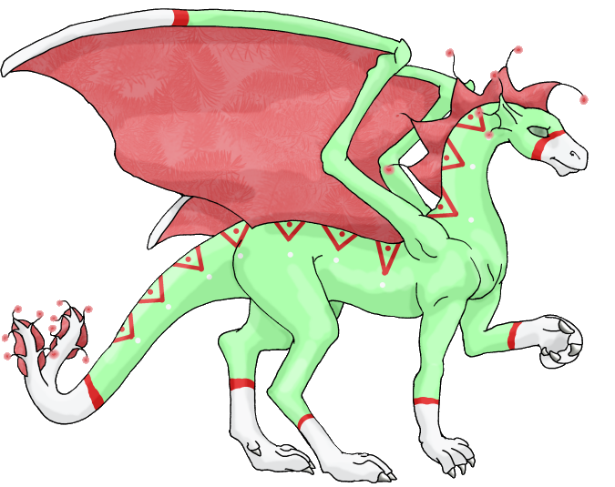 Clawed feet, split ended tail with webbed bob ends, bobbed tall crest on neck, bobbed ears, single-finvered wings, Myrsilk markings (non-standard magical associations - white-light, red-fire)