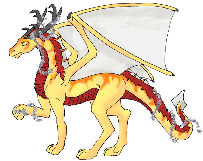 Fire-Marked, scale Belly, paws, spade tail, furry + webbed spines down full spine, Antlers, 2 fingered wings with claws, bling; Carries Drak 4 wings, Offspring f=**ra m=ra**