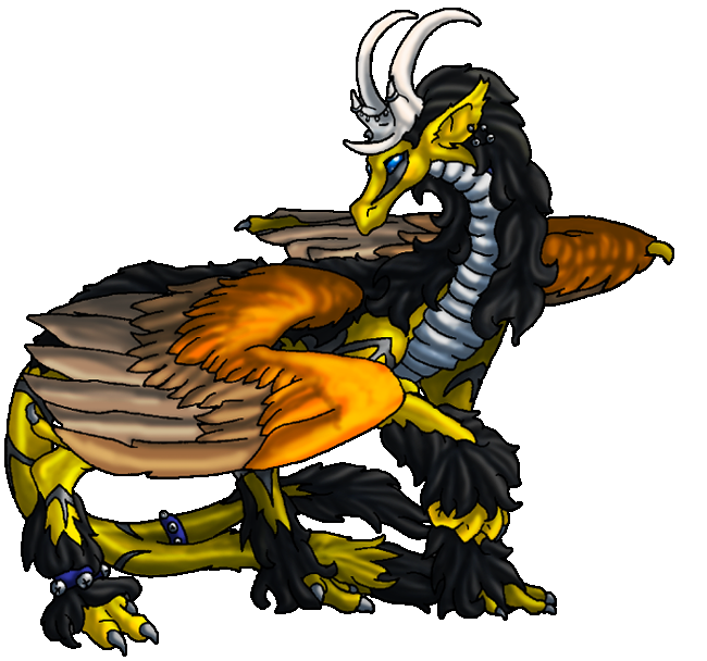 | Dragon: Zhuanash Houten Gender: Male Size: 8 foot at shoulder Colors: body - yellow, markings - silver, fringe - black, belly - lt blue, eyes - dark blue Powers: Shapeshifting, genrehopping, Chameleon hide, Heal self only, sonic manipulation, empathic cheer |